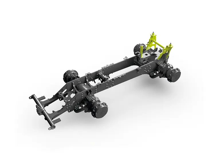 Grâce à son architecture unique, le XERION peut supporter des charges lourdes. Les traverses entre les longerons ne sont plus soudées, mais vissées, ce qui accroît la robustesse et la capacité de charge du châssis. Les essieux Heavy Duty supportent chacun une charge maximale de 15 t jusqu'à 50 km/h. En dépit de sa taille et de son poids, le XERION affiche une maniabilité et une agilité hors pair grâce à ses deux essieux directeurs.
